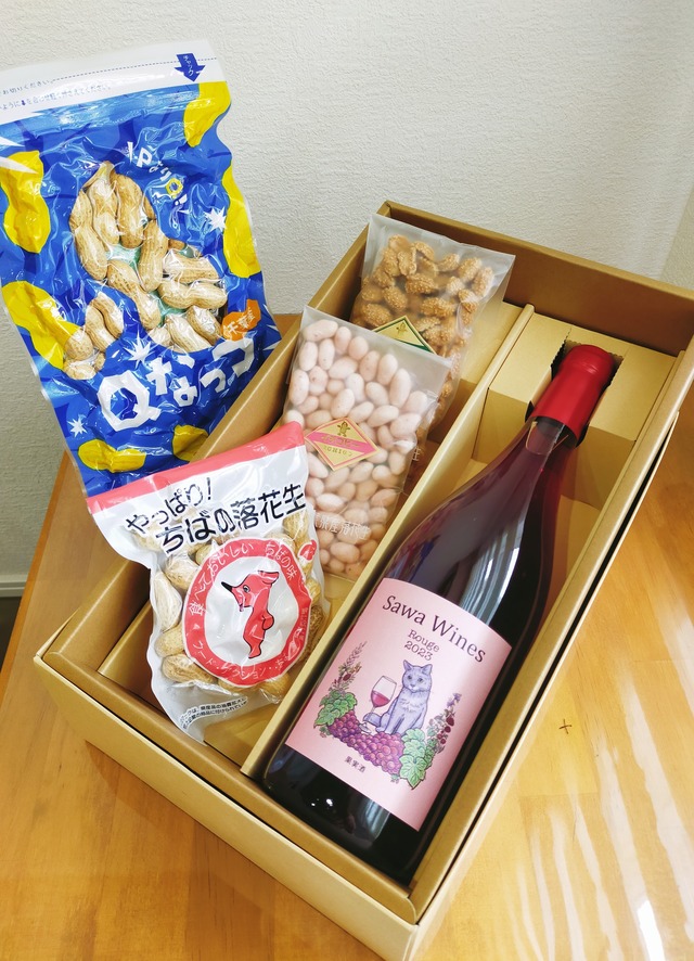 八街産のワインと落花生のセットです。 (料金には送料も含まれています。大変お得なセットになっております) ワインも落花生もどちらも八街産のものになります。 こちらのセット内容 「ルージュ2024」1本 「料金の5,500円から、ワイン代金と送料、箱代を引いたおよそ1,400円相当分の落花生」 (画像の内容はあくまでも参考です、その通り入るとは限りません) これらのセットをお送りします。 落花生の内容はその時期の商品によりますので、これとこれ、というご案内はできませんが、差し引き金額にふさわしい内容の商品をお届けさせていただきます。何が届くかは開けてからのお楽しみ! ※注意) 落花生も冷蔵設定でお送りする事になります。 品質に関しては問題ありませんが、落花生のパッケージを開封する際には、なるべく常温にもどしてから開封するようにお願いいたします。 (冷蔵から急に常温の空気に触れさせることは、品質の劣化につながる恐れがあります。まずはお手元に届いてから常温で置いていただき(通常1~2時間)その後開封していただきますとより美味しく召し上がれます。) ※重要! 配送日指定ができません。 土、日曜日のどちらかで発送します。 月~水曜日にご注文された場合は、その週末の土日に発送します。 木~日曜日にご注文された場合は、翌週の土日に発送となります。 (画像にあるスケジュールをご参照ください。) ※領収書をご利用の方は、購入時にメッセージをお願いします。