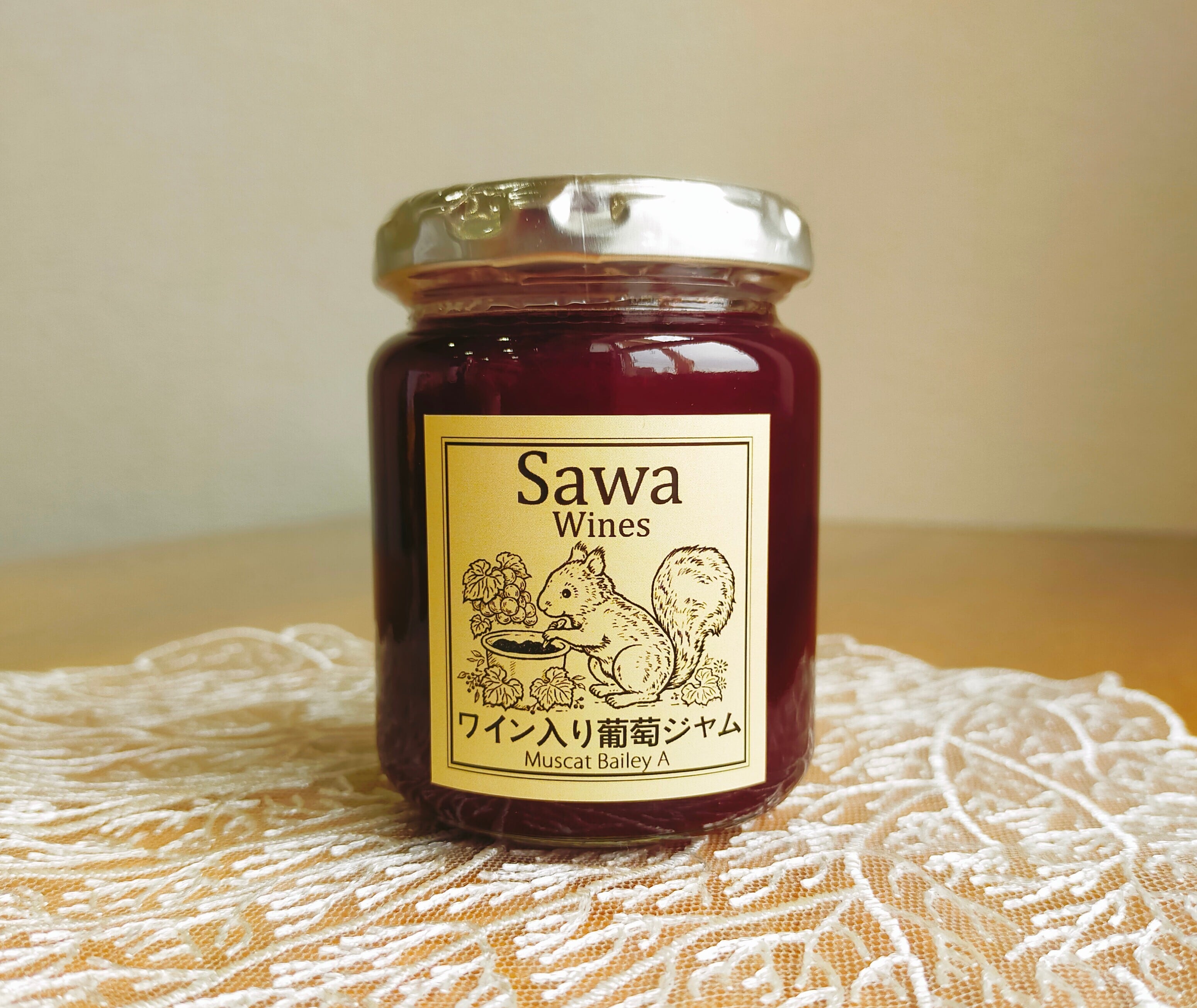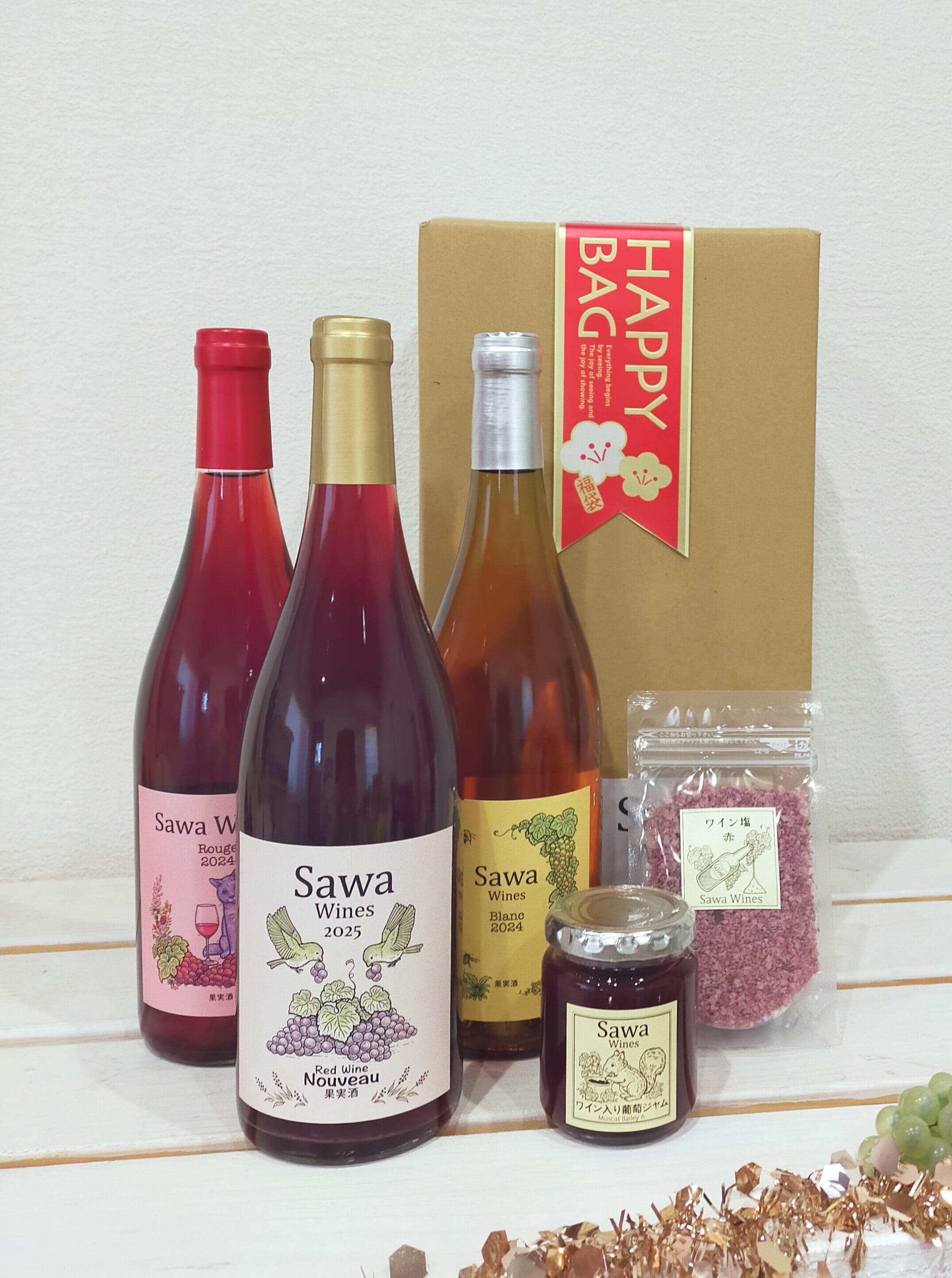 ワインが3本、そこに「ワイン入りぶどうジャム」と「ワイン塩」がついたセットです。